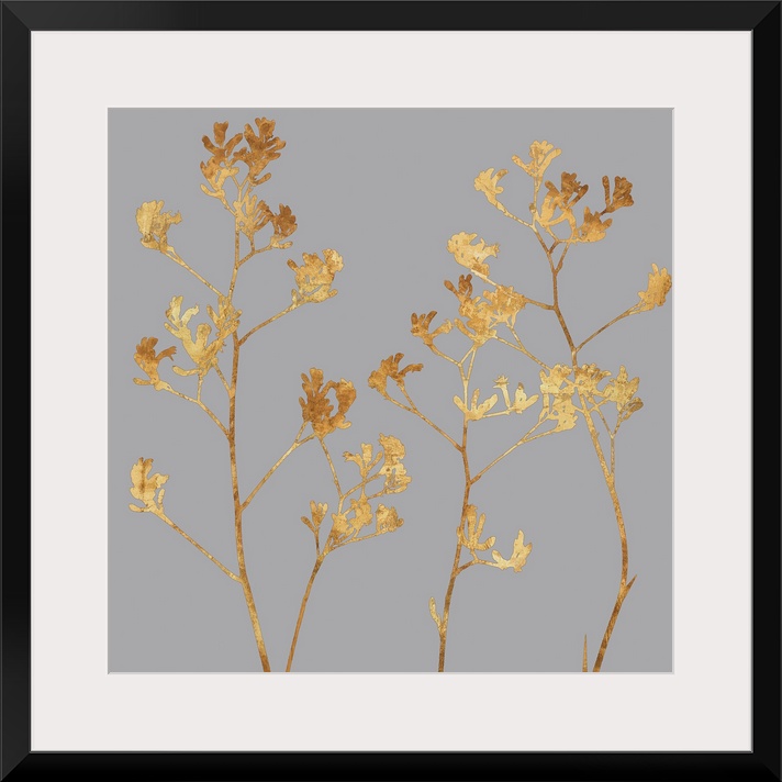<p>Square floral decor with golden silhouetted flowers on a grey background.</p>