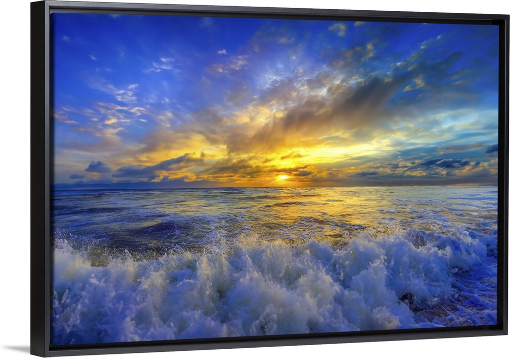 <p>A brilliant gold and blue sunset over crashing ocean waves.</p>
