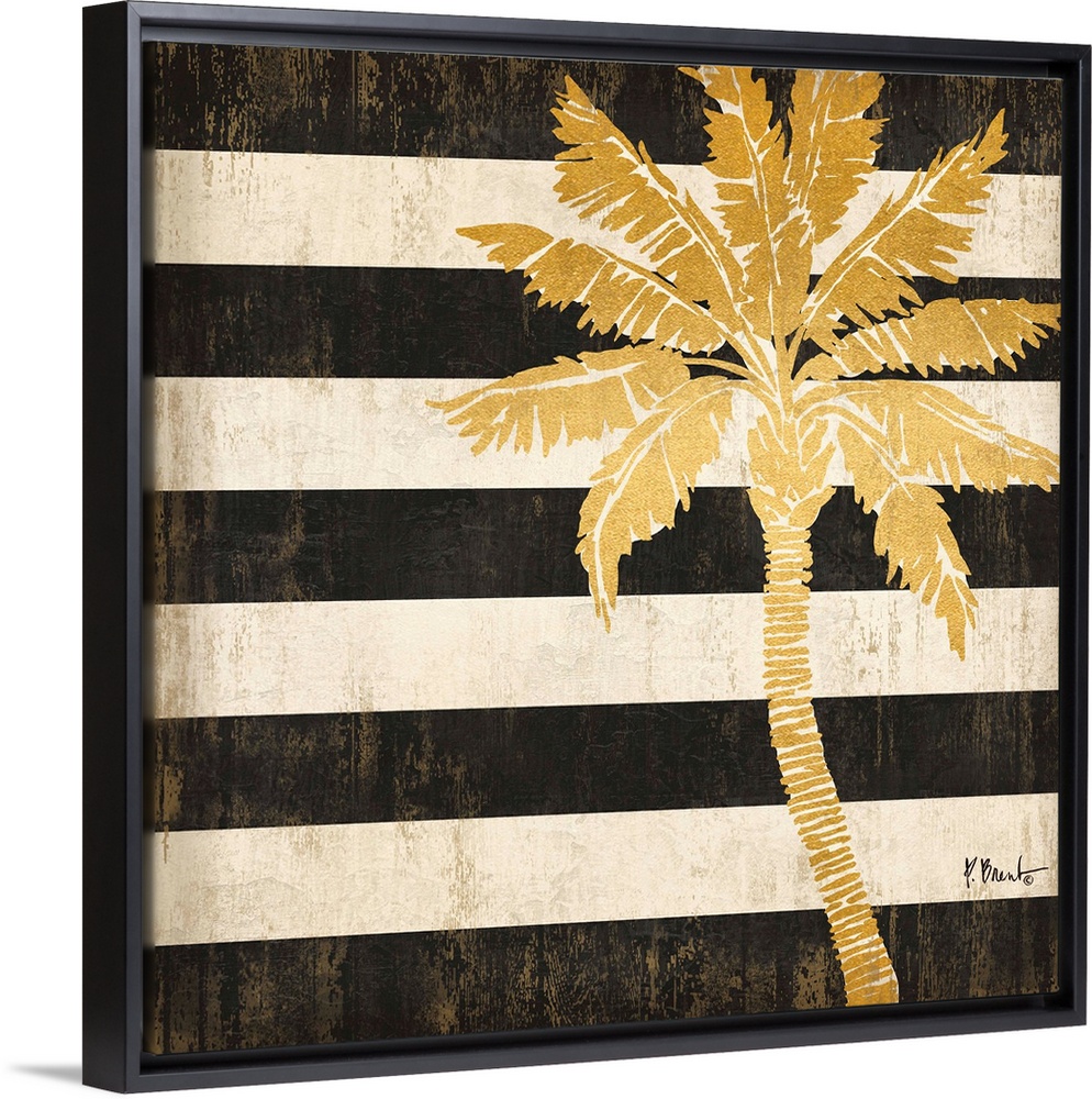<p>Square decor with a metallic gold palm tree on a black and white striped background.</p>