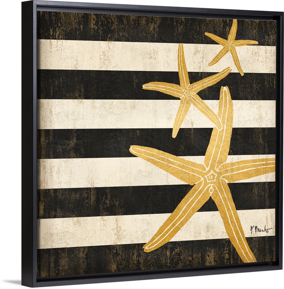 <p>Square decor with metallic gold starfish on a black and white striped background.</p>