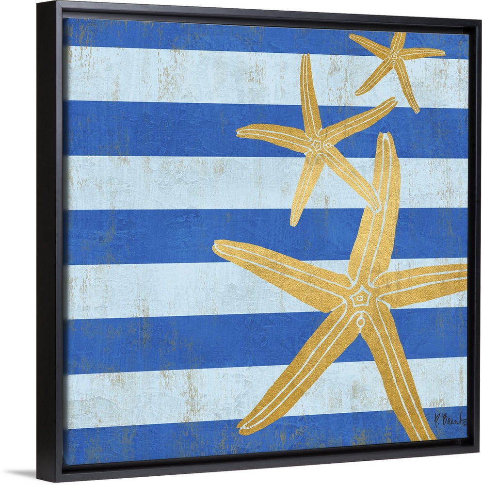<p>Square decor with metallic gold starfish on a blue striped background.</p>