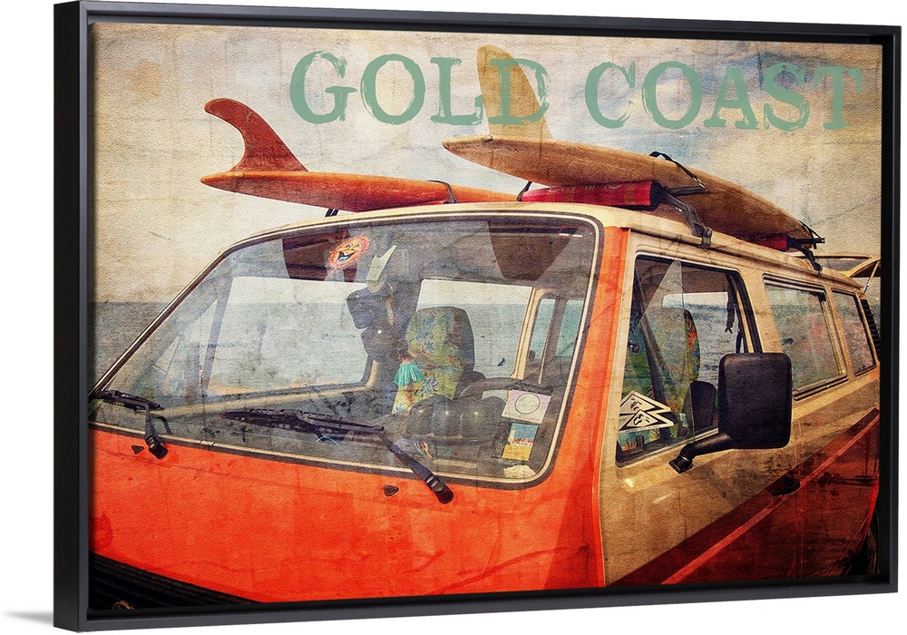 <p>A vintage orange VW bus with surf boards on the roof and the text 'Gold Coast' above and a distressed overlay applied.</p>