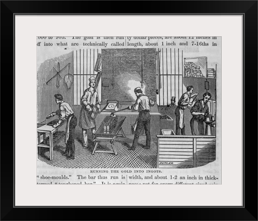 <p>A print depicts United States Mint workers as they process gold to make gold coins. San Francisco, California, USA.</p>