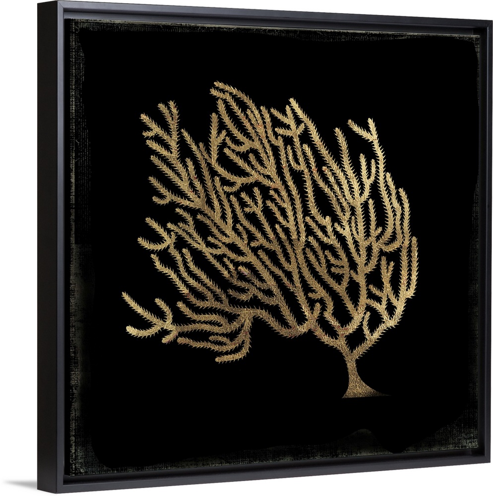 <p>Contemporary home decor artwork of golden coral against a black background.</p>