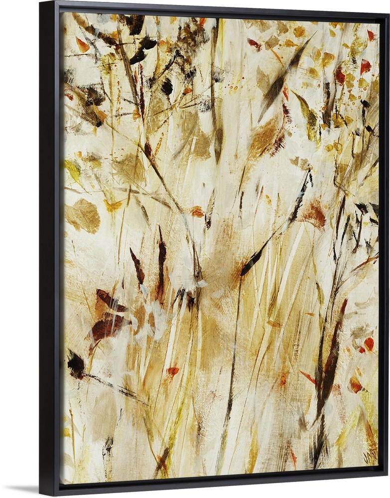 <p>Contemporary painting of warm, golden flowers and leaves on long branches that extend vertically on a vertically streaked background.</p>