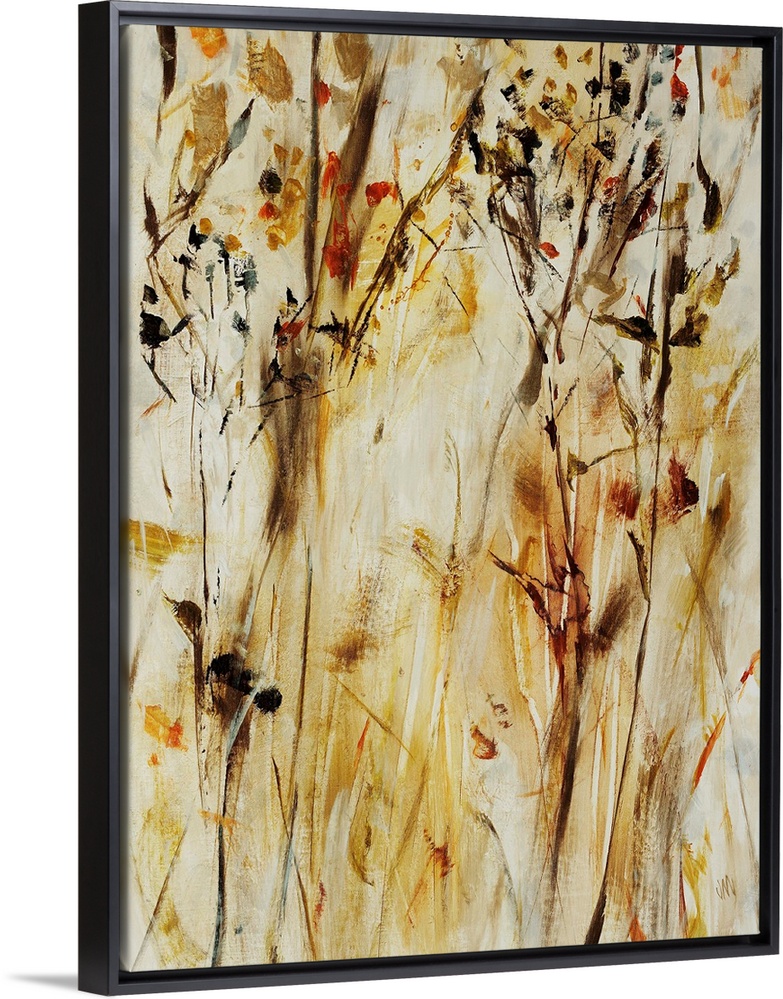 <p>Contemporary painting of warm, golden flowers and leaves on long branches that extend vertically on a vertically streaked background.</p>