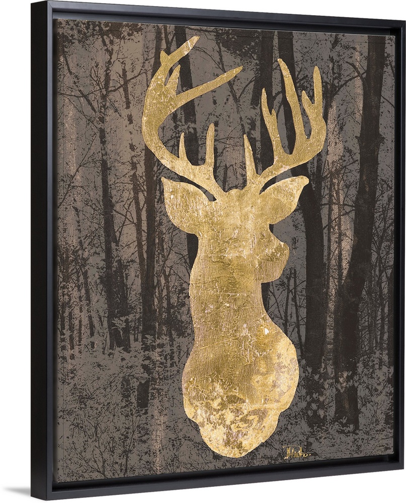 <p>Metallic gold silhouette of a deer on a dark background filled with trees.</p>