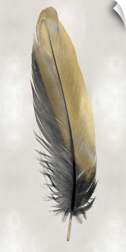 <p>Illustration of a black and metallic gold feather on a shiny silver background.</p>