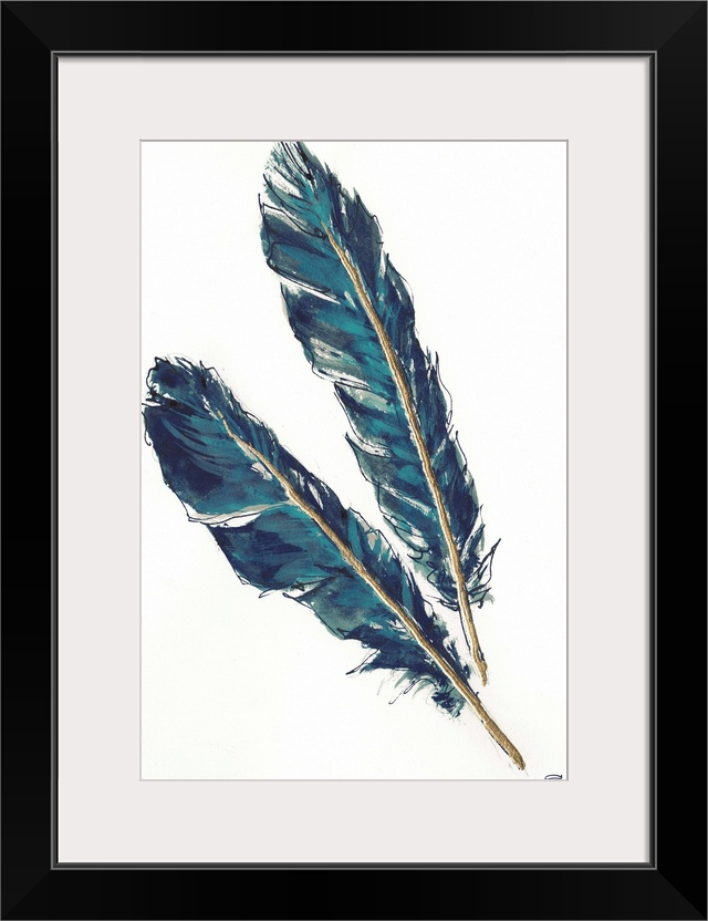 <p>Large vertical painting of two feathers with metallic blue and gold paint.</p>