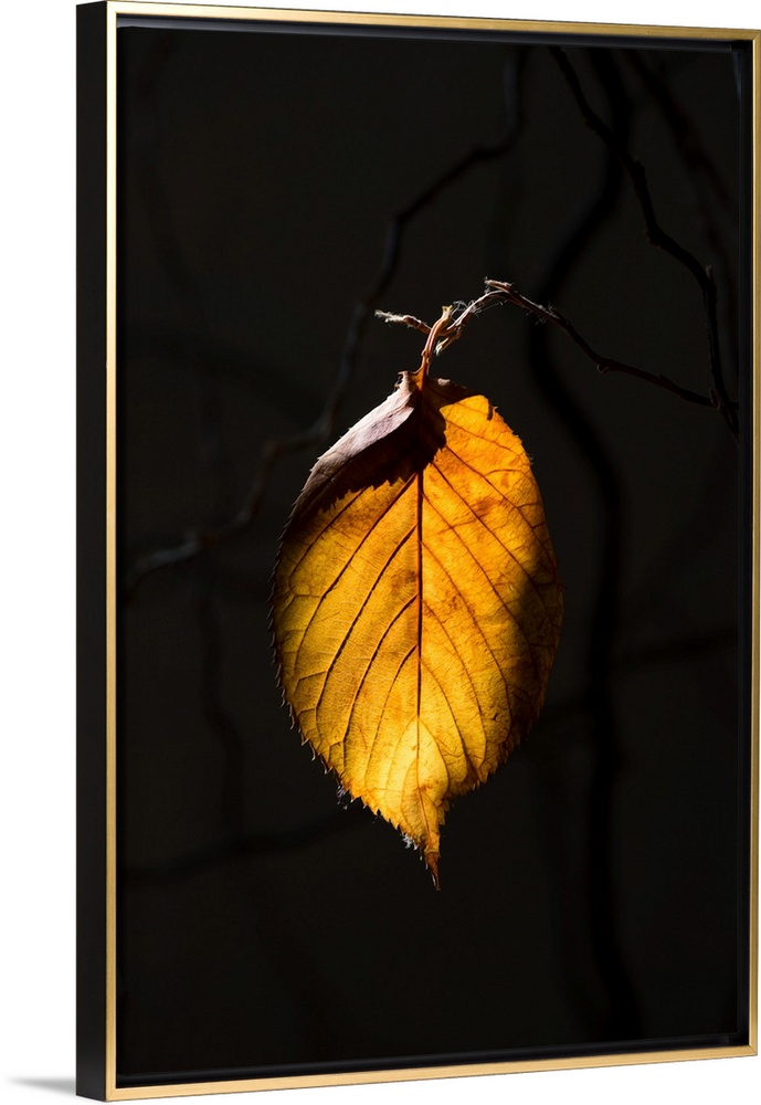 <p>Fine art photo of a single leaf in the sunlight against a dark background.</p>