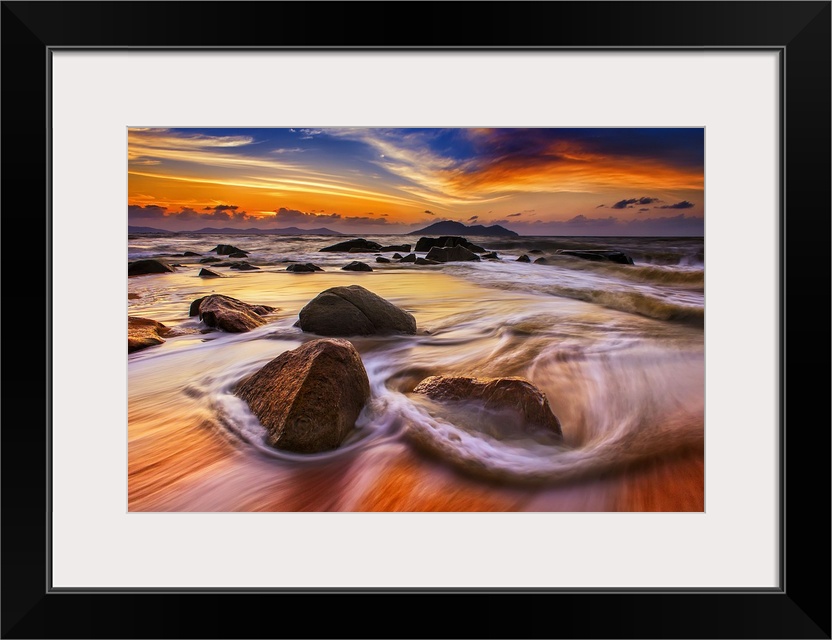 <p>Beautiful sunset over low tidewater rushing over rocks on the beach.</p>