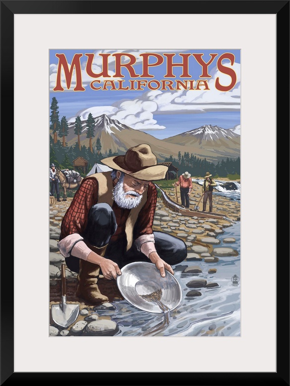 <p>Retro stylized art poster of an old man kneeling down beside stream, panning for gold.</p>
