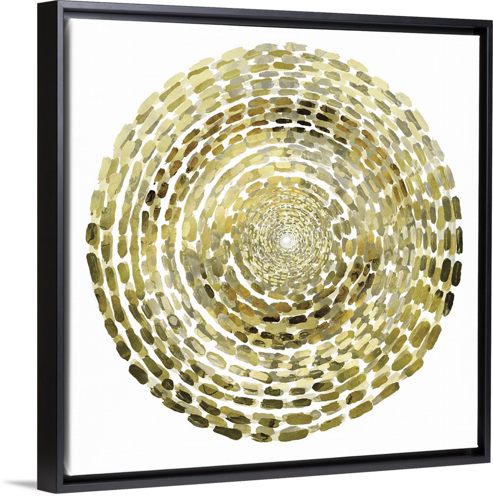 <p>Abstract painting of golden dashes in a circular pattern.</p>