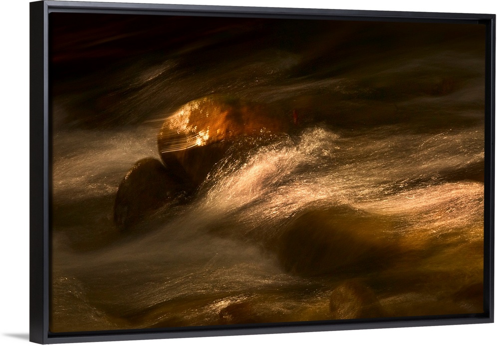<p>Photograph taken of rushing water gliding over rocks that are touched by spots of sunlight.</p>
