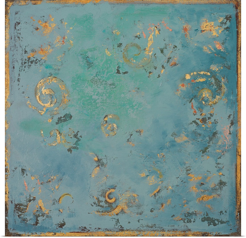 <p>A contemporary abstract painting of gold swirls on a blue background with hints of green.</p>