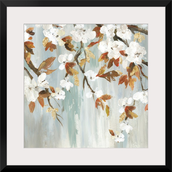 <p>A contemporary painting of white flower blooms on leaf covered branches against a neutral textured backdrop.</p>