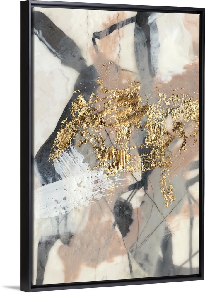 <p>Abstract of chaotic brush strokes of gray, black and beige in washed out shaded on a cream background with metallic gold accents.</p>