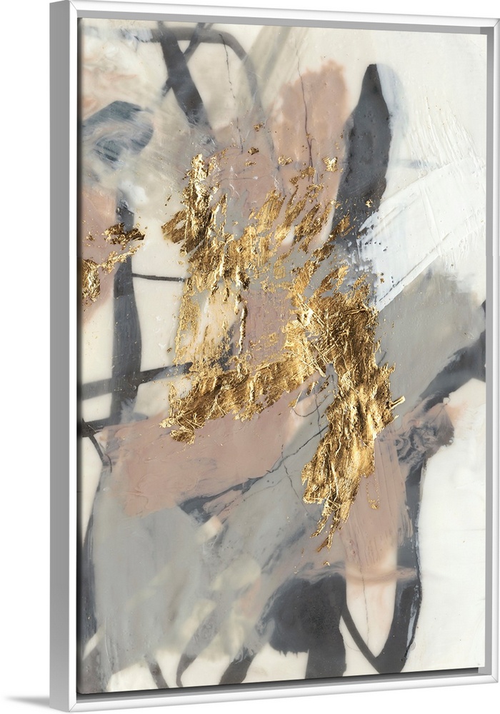 <p>Abstract of chaotic brush strokes of gray, black and beige in washed out shaded on a cream background with metallic gold accents.</p>
