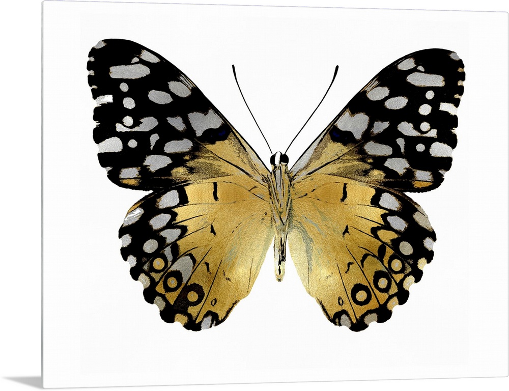 <p>Illustration of a gold, silver, and black butterfly on a white background.</p>