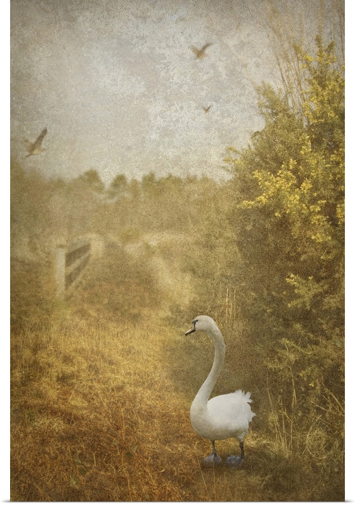 <p>golden country scene with phesants flying and a swan in the foreground</p>