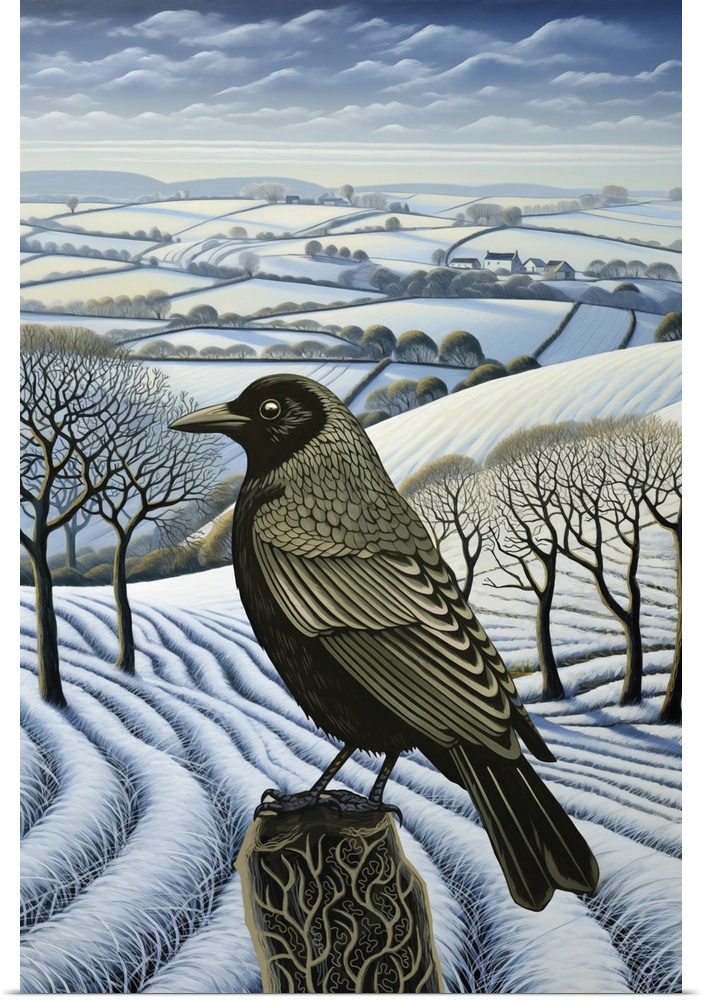 <p>A crow looks out over a winter landscape near the South Downs in southern England, UK. It is sitting on a post.</p>