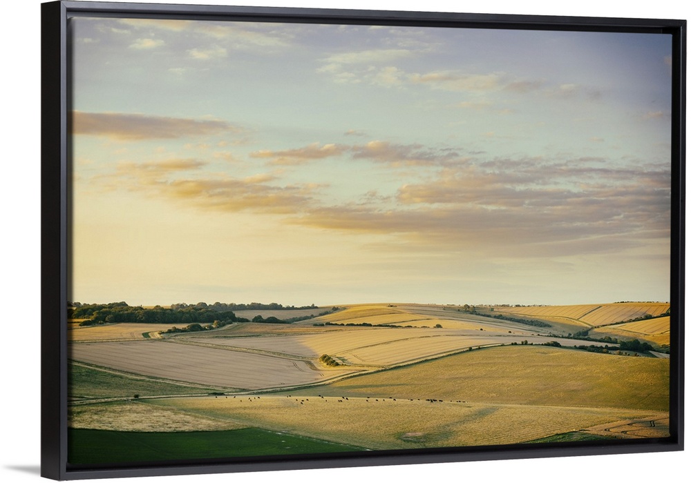 <p>Golden evening light touching the Downland harvest fields. View from Cissbury Ring on the South Downs in West Sussex, England.</p>