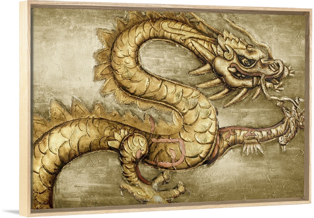 <p>Contemporary home decor artwork of a golden wall with a ferocious dragon on it.</p>