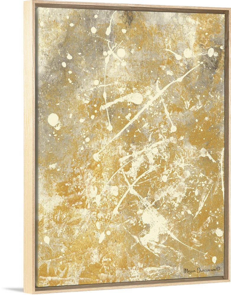 <p>A contemporary abstract painting with a gold and grey background that has cream paint splattered on top.</p>