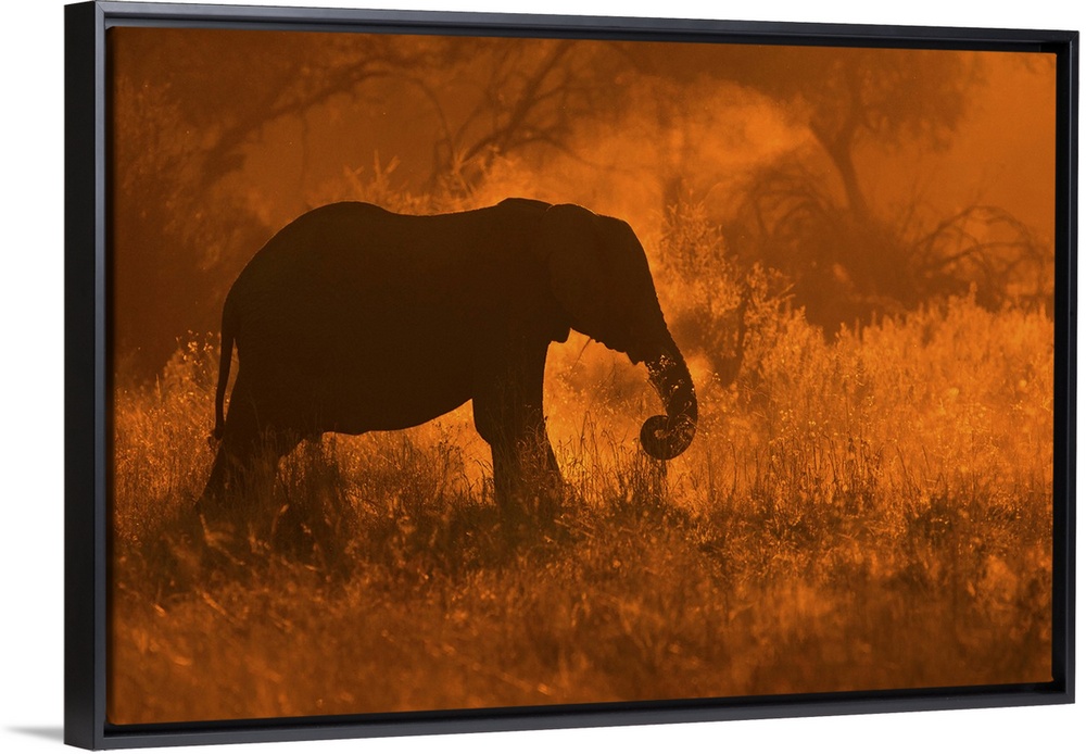 <p>A silhouette of an elephant dusting off shoots of grass in golden light in Savute.</p>