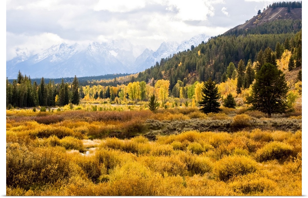 <p>Golden fall colors of shrubs and cottonwoods along Pacific Creek in Yellowstone National Park with the blue, snow capped mountains of the Teton Range in Grand Teton National Park Wyoming, United States of America</p>