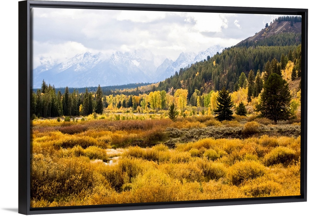 <p>Golden fall colors of shrubs and cottonwoods along Pacific Creek in Yellowstone National Park with the blue, snow capped mountains of the Teton Range in Grand Teton National Park Wyoming, United States of America</p>