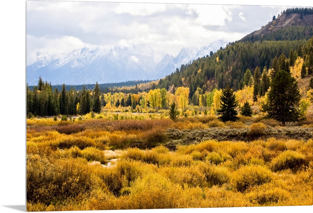 <p>Golden fall colors of shrubs and cottonwoods along Pacific Creek in Yellowstone National Park with the blue, snow capped mountains of the Teton Range in Grand Teton National Park Wyoming, United States of America</p>