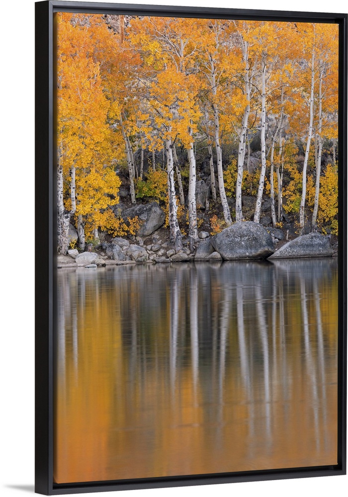 <p>Golden coloured fall foliage and reflections on the shores of Intake 2 lake in the Eastern Sierras, Nr Bishop, California, USA. Autumn (October)</p>