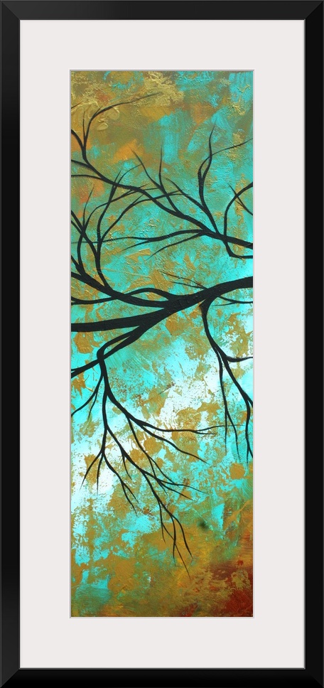 <p>Vertical panoramic painting of silhouetted tree branches with abstract background.</p>