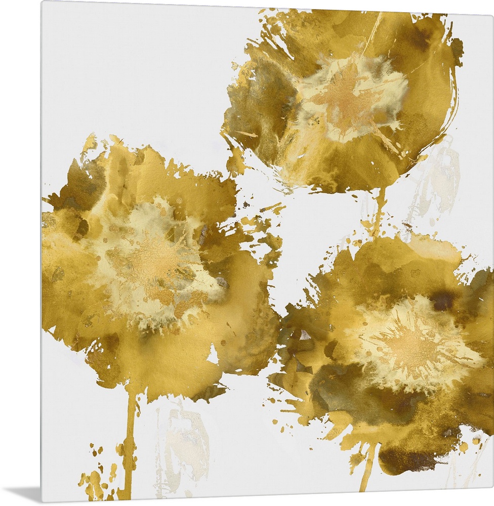 <p>Square decor with three paint splattered flowers in shades of gold.</p>