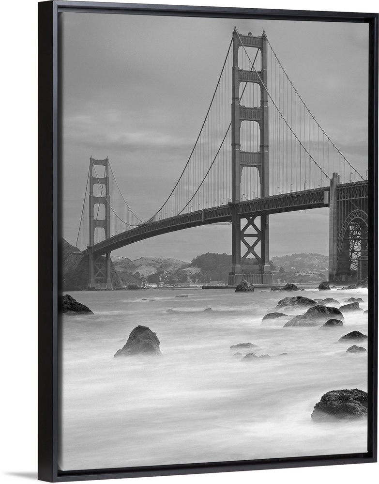 <p>Photo on canvas of the Golden Gate Bridge with wave breaking through rocks in the water.</p>