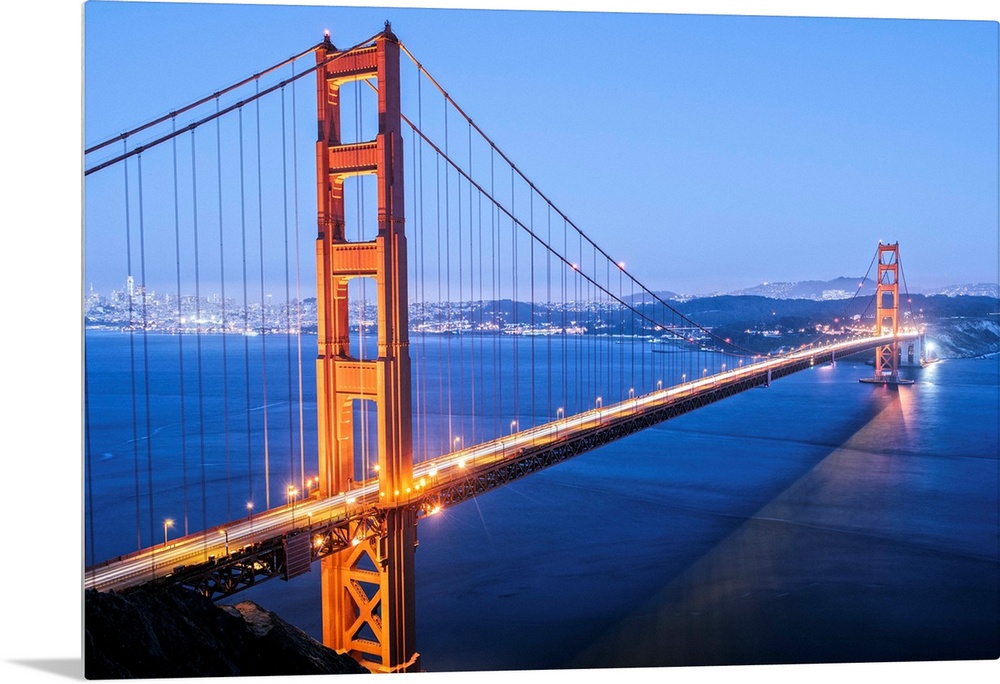<p>Cool toned photograph of the Golden Gate Bridge lit up at twilight with the city lights in the background.</p>