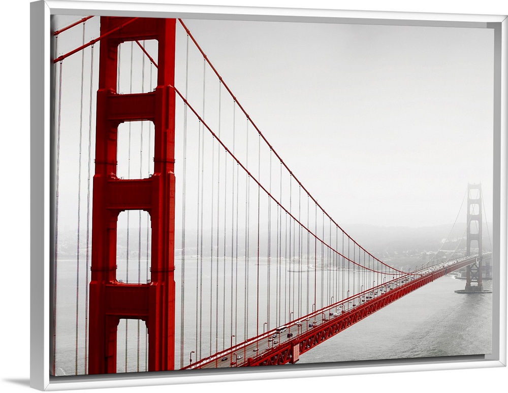 <p>Horizontal photograph of the Golden Gate Bridge in fog in black and white with selective color on the bridge.</p>