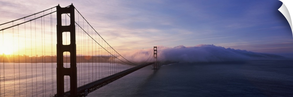 <p>The Golden Gate Bridge is photographed in panoramic view looking from one end down to the other where there is a large cloud hovering on the bridge.</p>