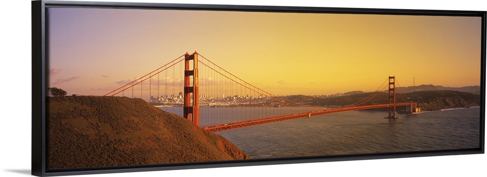 <p>Panoramic photo of the Golden Gate Bridge with a bright sky and the city in the distance.</p>