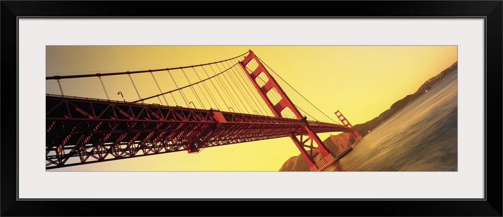<p>Panoramic photograph taken from the ground looking up at a famous suspension bridge found within California. The intricate architecture below the deck and cables above can be seen spanning the mile long gap towards the mountains in the distance.</p>
