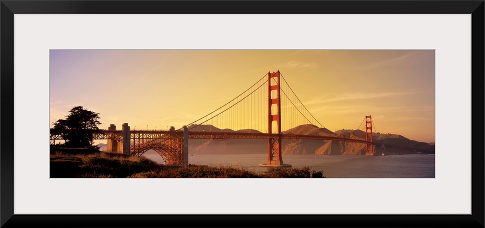 <p>Giant horizontal photograph of San Francisco Bay's suspension bridge, the Golden Gate Bridge, at sunrise.</p>