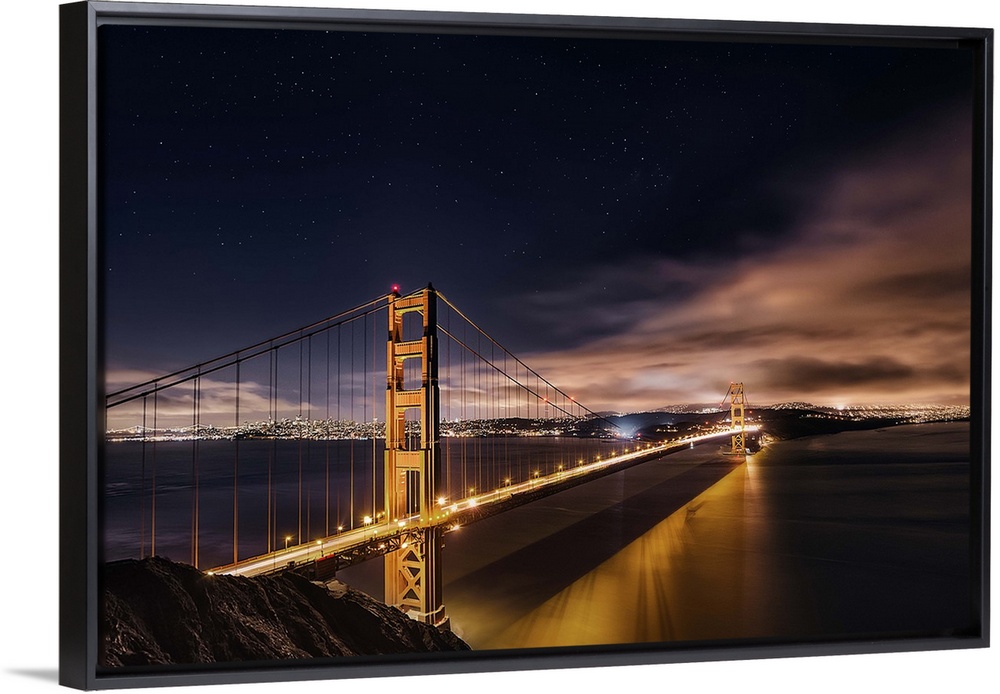 <p>Photograph of the Golden Gate Bridge lit up at night.</p>