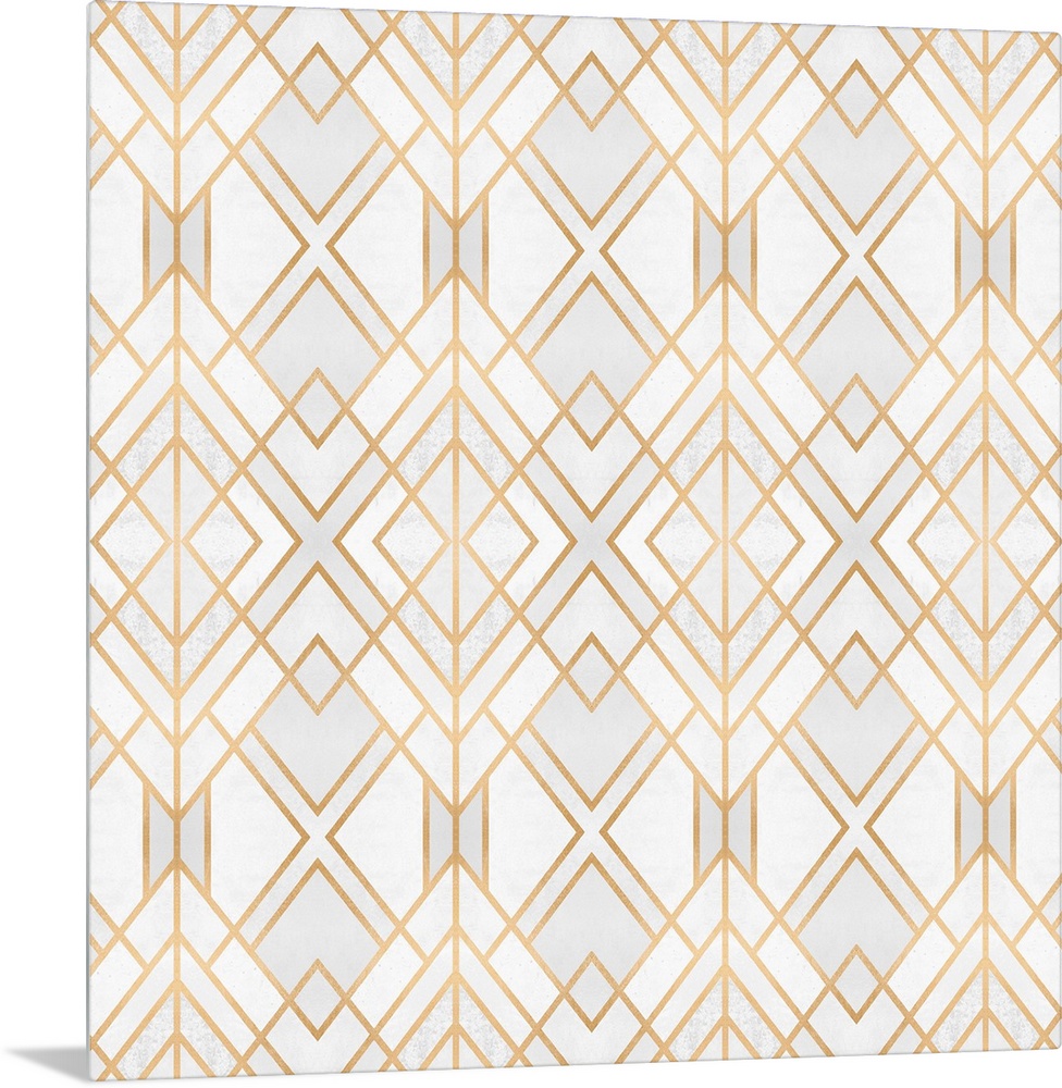 <p>A geometric, ikat-type design in shades of white and grey, outlined in gold lines.</p>
