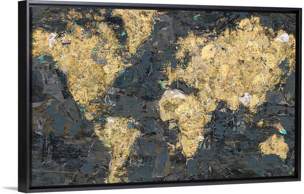 <p>A textured abstract painting of the world map in gray and gold colors.</p>