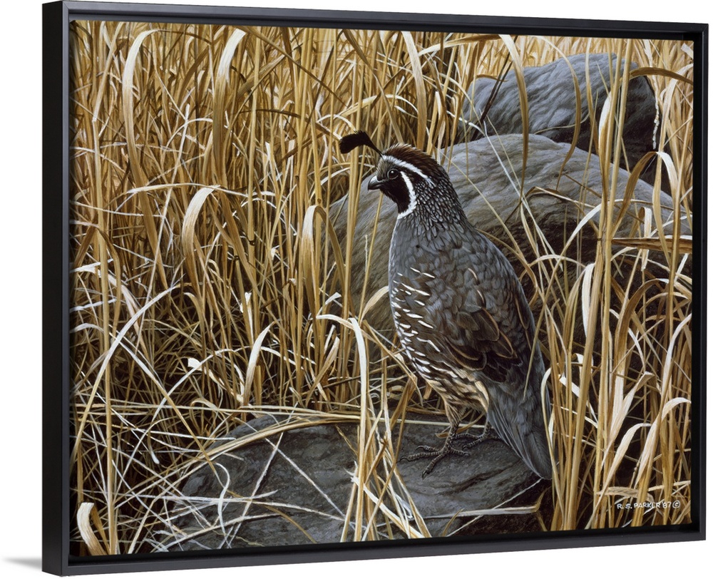 <p>A quail rests next to a large rock in the high grasses.</p>