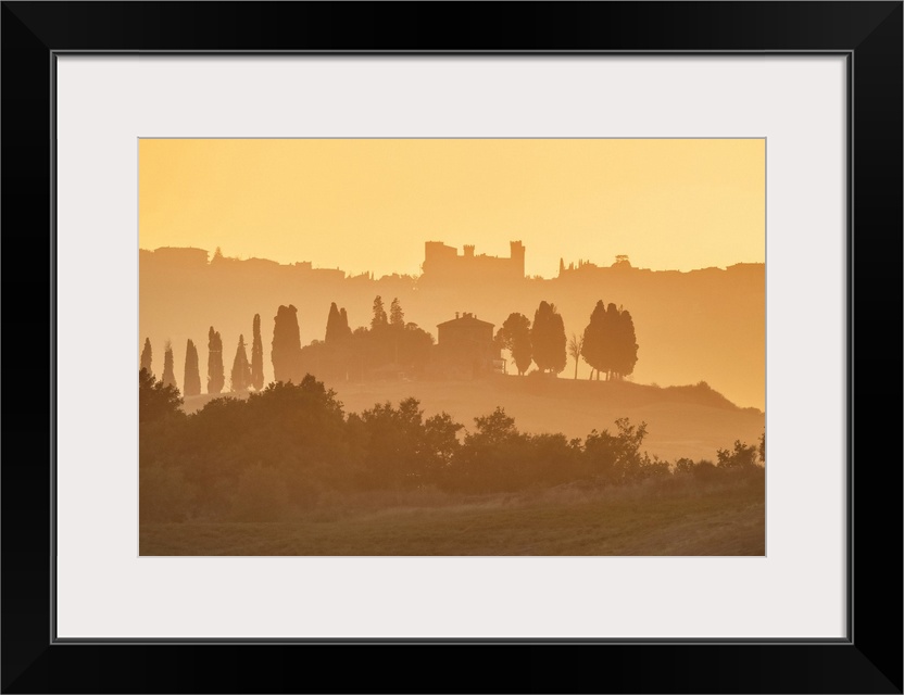 <p>Golden hazy landscape at dusk, Val d'Orcia, near San Quirico d'Orcia, Tuscany, Italy.</p>