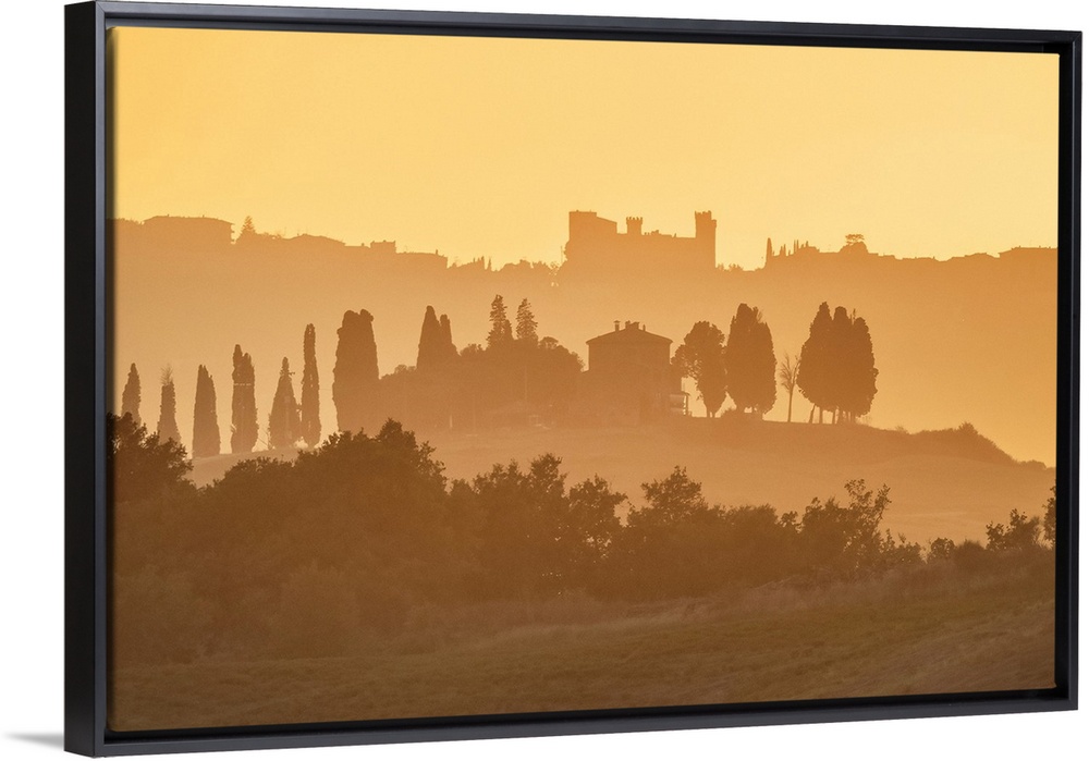 <p>Golden hazy landscape at dusk, Val d'Orcia, near San Quirico d'Orcia, Tuscany, Italy.</p>