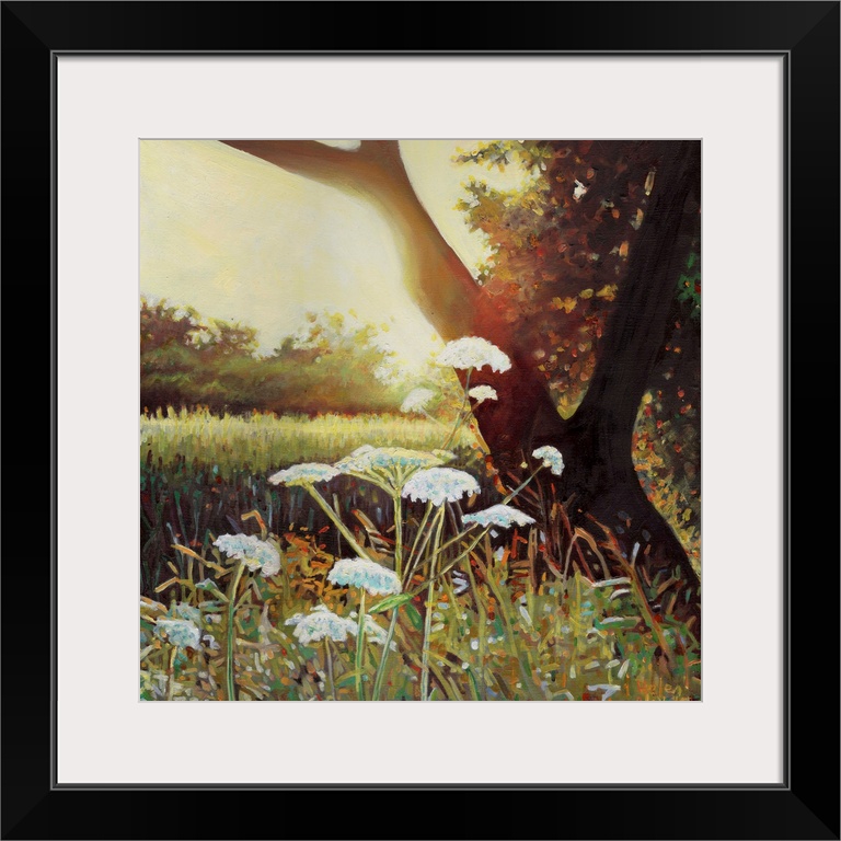 <p>Contemporary painting of wildflowers in a forest clearing at sunset.</p>