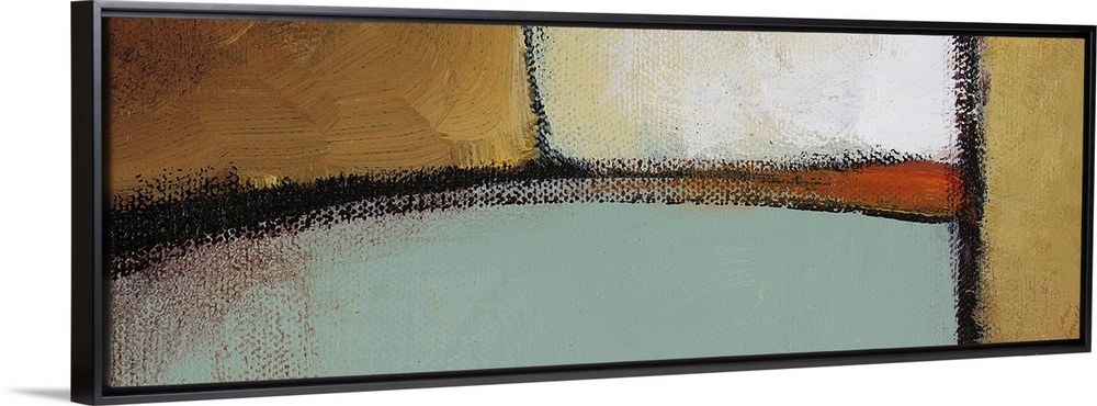 <p>Horizontal abstract painting in earth tones featuring deliberate brushstrokes and strong black lines.</p>